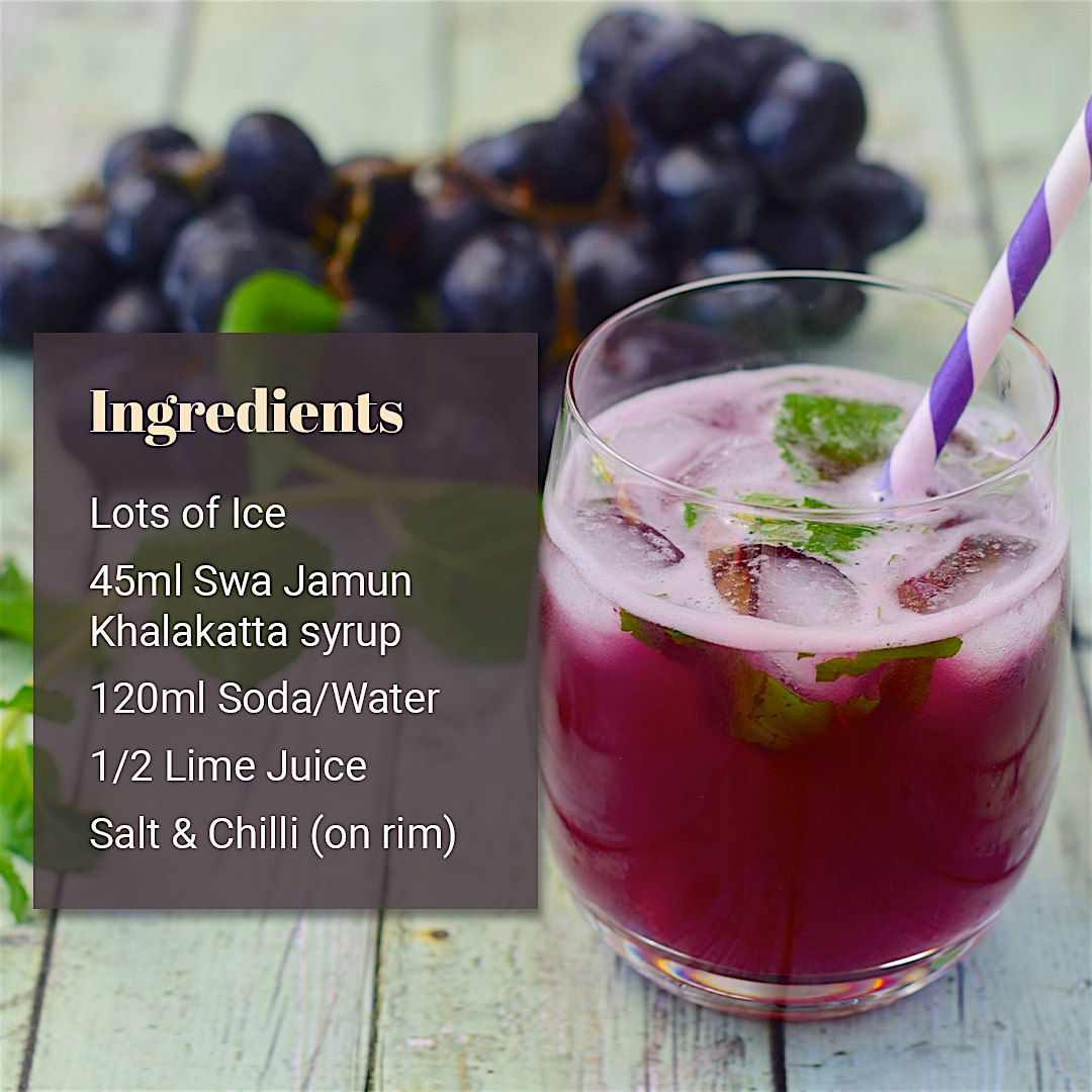 You can add one part Swa Jamun Kala Khatta to six parts of water and ice to whip up a simple yet delicious Jamun mocktail.